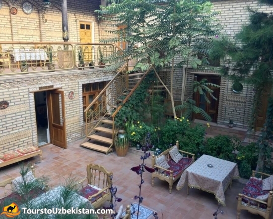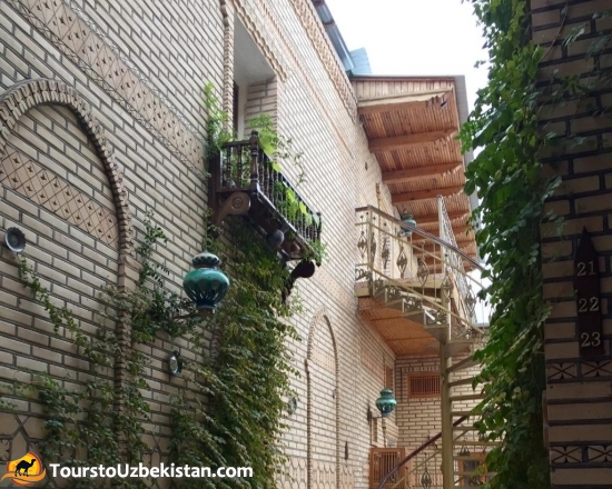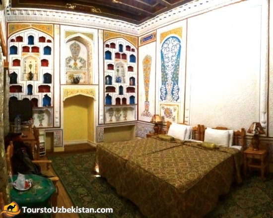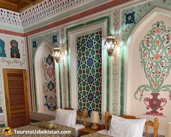 Hotel "Sasha and Son" is one of the first private hotels in Bukhara, which initiated the practice the accommodation of the tourists in private homes. The hotel is located in the heart of Old city, in a few minutes from the architectural ensemble «Lyabi Hauz». All rooms are individually designed in traditional Bukhara style with carpets and trimming. Home atmosphere and personal hospitality awaits guests in this charming small hotel with best private hotel facilities. The walls are covered with floral and geometric patterns, in the niches there are arranged dishes.