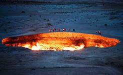 The accumulation of underground gas was discovered by the Soviet scientists in the village Darwaza in 1971. During the excavations, geologists found an underground cavern (empty), because of it the land failed and there was a large abyss filled with gas. It was decided to set fire in order to avoid harmful gas for human and animals. Accordance to the hypothesis of geologists, the fire had to go out in a few days, strangely enough, but they were wrong. Since then natural gas has been burning without ceasing. Thousand of insects come here to the light and heat, but they are doomed. The distance to nearest village Erbent is 90 kilometre.