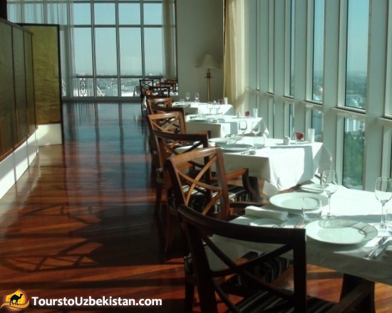 The layout of the space, with a raised bar, provides a private, intimate setting for small groups or families. The large bay windows overlooking the city make it a part of downtown Ashgabat that is still protected from the bustle of downtown