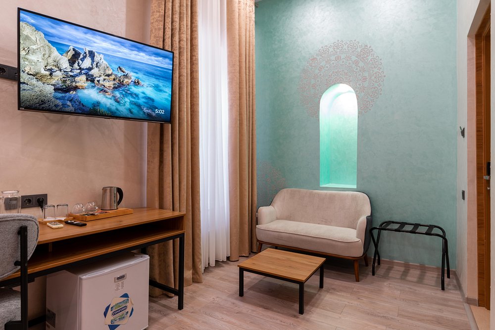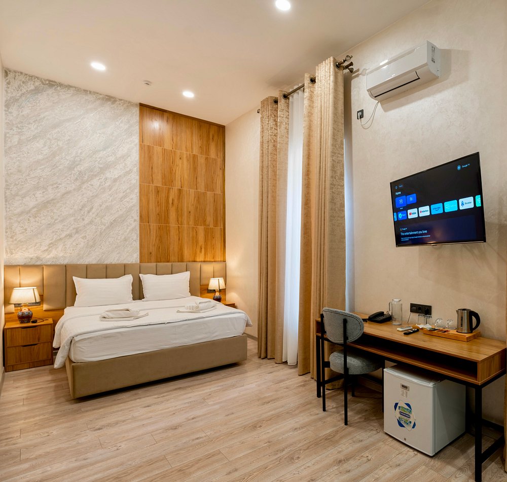 Hotel provides modern and comfortable rooms. Standard and Luxury rooms with large and comfortable beds are equipped with an air conditioner and satellite TV. You can enjoy drinking tea in summer tea house of the hotel, after exciting sightseeing of the city.